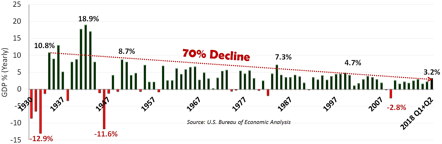 This chart, derived from BEA data, indicates that the U.S. GDP history from 1930 to present has been on a downward trend. Since the first positive GDP growth year after the end of the Great Depression, U.S. GDP growth declined 70% from 10.8% in 1934 to 3.2% today (average of the first two quarters in 2018). Hopefully, the BEA’s Q2 2018’s 4.1% estimate signals the beginning of an upward trend as opposed to a temporary anomaly. Barring an international or domestic crisis, which is certainly a possibility, President Trump’s aggressive economic restructuring (tax cuts and reform, reduced regulatory environment and balanced trade negotiations) will propel the American economy on a decidedly upward track.