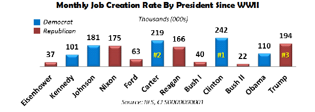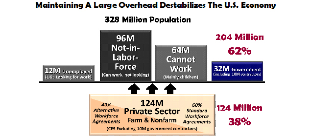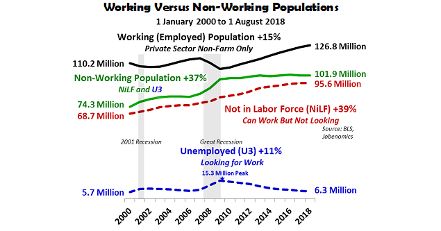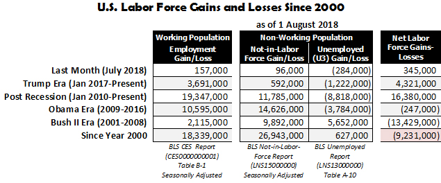 The U.S. Civilian Noninstitutional Population (the total of the BLS Employed, Unemployed and Not-in-Labor-Force categories) is weaker by 9,231,000 workers today than it was in January 2000. However, during the 19-month Trump Administration, the net Civilian Noninstitutional Population has increased by 4,321,000 (+3,691,000 more citizens employed, 1,222,000 fewer citizens unemployed but 592,000 more people in the Not-in-Labor-Force). In comparison, during the 96-month (8-years) during the Obama and G.W. Bush Administrations, Civilian Noninstitutional Population losses amounted to 247,000 and 13,429,000, respectively.