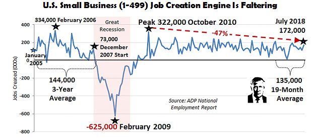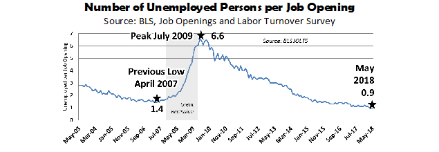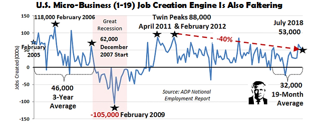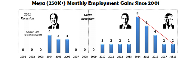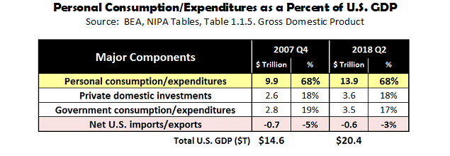 The latest U.S. Bureau of Labor Statistics (BLS)[4] and ADP Research Institute[5] employment reports for July 2018 indicate that the United States created only 157,000 (+170,000 private sector workers and -13,000 government employees) and 219,000 (private sector) new jobs, respectively. Both figures are below the monthly 250,000 job threshold advocated by most economists. The number of unemployed (U3 rate) decreased by 284,000 citizens, which was offset by an increase of 96,000 voluntary workforce departures to the BLS Not-in-Labor-Force category (i.e., people who can work but don’t work).