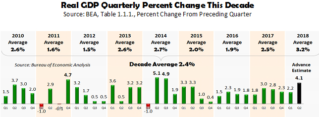 As reported on 27 July 2018 by the Bureau of Economic Analysis (BEA)[1], U.S. Q2 2018 GDP growth reached 4.1%. The last time that the United States breached 4% in a single quarter was in Q3 2014. Since the turn of the Century (the year 2000), out of a total of 74-quarters, only 11-quarters broke the 4% barrier. As of 3 August 2018, the Federal Reserve Bank of Atlanta’s GDPNow[2] estimate for Q3 2018 is 4.4% and the Federal Reserve Bank of New York’s Nowcast[3] estimate is 2.58%. If President Trump can achieve his goal of sustained 4% GDP growth over the next decade, the U.S. economy will boom and American workers should be euphoric since this rate of GDP growth indicates that the President’s goal of creating 25 million new jobs is also achievable.