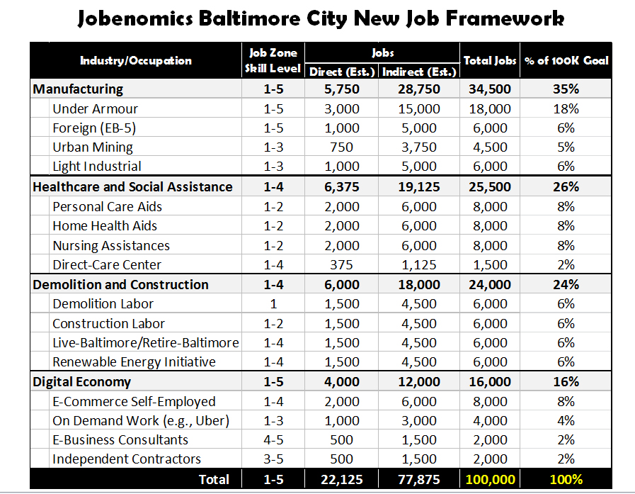 Jobenomics Baltimore City’s New Job Framework is tailored to the demographics of Baltimore City. As shown, emphasis is being given to lower skill zones that tend to be more predominant in the poor sections of the inner-city. To date, the Jobenomics Baltimore City plan has been endorsed and lead by community leaders who are now getting endorsement and support from major corporations (Under Amour for manufacturing) and major medical institutions for the healthcare and social assistance programs. The team is also working with non-profits, the State and City managers to finalize and implement an actionable plan.