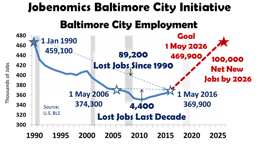 Jobenomics is pleased to announce a partnership with leading community leaders, led by Dr. Al Hathaway, Commissioner of the Maryland Governor’s Workforce Investment Board. Jobenomics Baltimore City’s goal is to restore the inner-city labor force by creating 100,000 net new jobs in Baltimore City within the next 10 years with emphasis on minorities, women, new workforce entrants and the contingent workforce. Jobenomics Baltimore City will institute local Community-Based Business Generators to mass-produce inner-city businesses in order to achieve the 100,000 new job goal.
