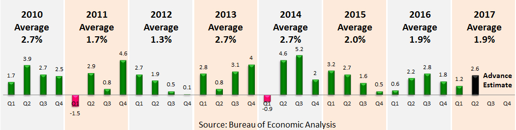 According to the U.S. Bureau of Economic Analysis (BEA), during the post-recession recovery period from Q1 2010 through Q1 2017, U.S. GDP averaged 2.25%. In 2015 and 2016, U.S. GDP grew by subpar rates of 2.0% and 1.9% respectively. During the first two quarters of the Trump Administration, GDP averaged 1.9%.