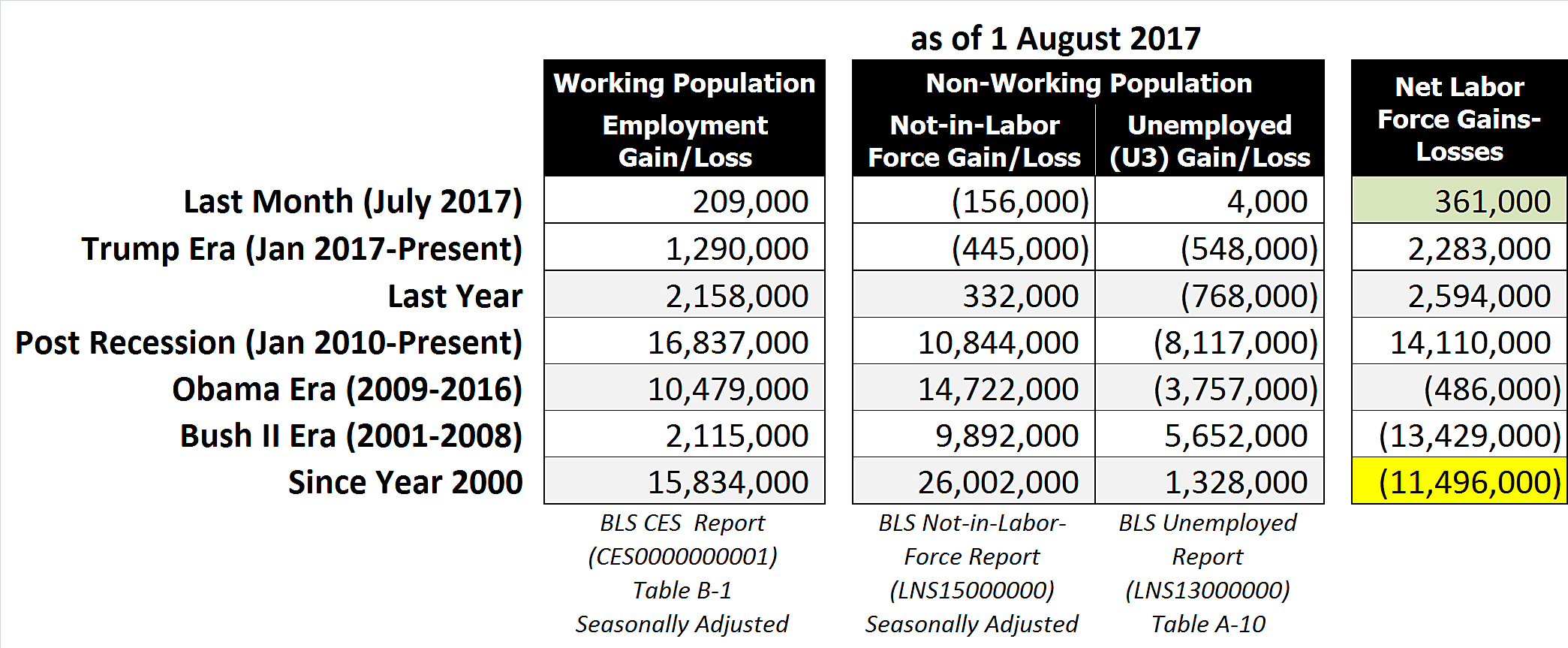 In regard to the Working Population, the 4 August 2017 BLS Employment Situation Summary reports that the United States produced a total of 209,000 new jobs in July—a solid job gain but a number below the 250,000 new job standard advocated by most economists in order to grow the U.S. economy a robust rate to compensate for future financial downturns. In regard to the Non-Working Population, the BLS reports 156,000 less people are now enrolled in the Not-in-Labor-Force category (a BLS category of for people who can work but choose not to work). This 156,000 person reduction in Not-in-Labor-Force category is a positive indicator that able-bodied citizens that were sidelined from working (due to frustration, welfare, early retirement, education, etc.) are beginning to return. The BLS also reports that the Official U3 Unemployment rate dropped slightly from 4.4% to 4.3% (a post-Great Recession low) even though the number of unemployed people actually grew by 4,000 people from 6,977,000 in June to 6,981,000 in July. Note: unemployment rates are calculated as a percentage of the civilian labor force that grew from 160,145,000 in June to 160,494,000 in July, a gain of 349,000—a movement in the right direction. As calculated by Jobenomics, the overall U.S. labor force situation grew by a net 361,000 (highlighted in green above), which is a healthy number as well as a positive barometer for economic growth.