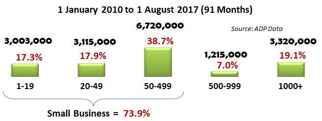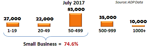 Of the 178,000 U.S. non-farm private sector new jobs, the ADP National Employment Report calculates that small businesses (1-49 employees) produced 50,000 new jobs (28.1% of the total), midsized businesses (50-499 employees) produced 83,000 new jobs (46.6%), and large businesses (500 or more employees) produced 45,000 new jobs (25.3%). For the purposes of this report, Jobenomics classifies small business as having 1-499 employees (the definition supported by the U.S. Small Business Administration), midsized business as 500-999 and large businesses as 1000+ employees. In addition, Jobenomics considers micro-businesses having 1-19 employees, which includes self-employed businesses.