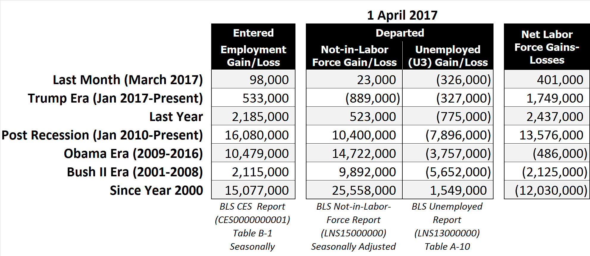 The Bureau of Labor Statistics (BLS) Employment Situation Summary reported that last month (March 2017), 98,000 Americans entered the U.S. labor force, 23,000 more Americans were recorded in the BLS’ “Not-in-Labor-Force” category (a category reserved for able-bodied Americans who choose not to work and voluntarily depart the workforce), and 326,000 less citizens were categorized as officially unemployed, for a net workforce gain of 401,000 Americans.