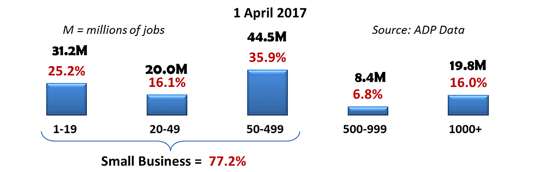 As reported by the ADP National Employment Report, small businesses are undeniably the dominant employer and job creator in the United States. According to ADP, small businesses with less than 500 employees employ 77.2% of all private sector Americans with a total of 95,621,721 employees—over 3.4-times the amount of large businesses with more than 500 employees that have 28,162,205 employees. Micro and self-employed businesses with 1-19 employees employ 1.6-times the number of major corporations with over 1,000 employees (31,159.668 versus 19,785,301).