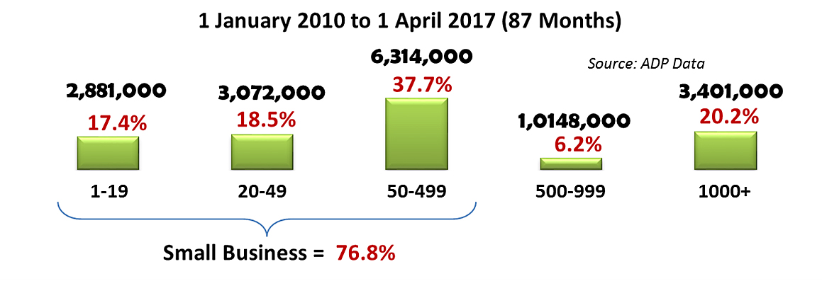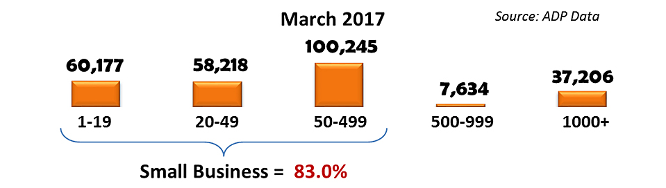 Last month (March 2017), U.S. small business created 83.0% of all new U.S. jobs. While most of the America’s and the world’s attention is focused on the Trump Administration’s big business focus (e.g., reshoring jobs and trade policies), it is small business that produced 218,640 (83%) out of the record 263,480 new private sector jobs last month.