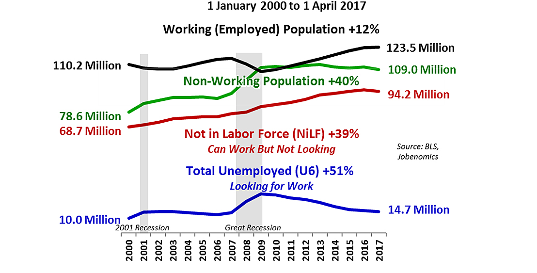 As shown, from 2000 to 2017, the Working (Employed) population rose by 12% compared to the Non-Working Population rise of 40%. Jobenomics defines the Non-Working Population as Not-in-Labor Force (that rose by 39%) and Total Unemployed (which is still 51% higher today than year 2000). If these trends continue, Jobenomics predicts that the U.S. Not-in-Labor-Force will equal the Employed population by the mid-2020s, or sooner if the United States suffers a major financial crisis.
