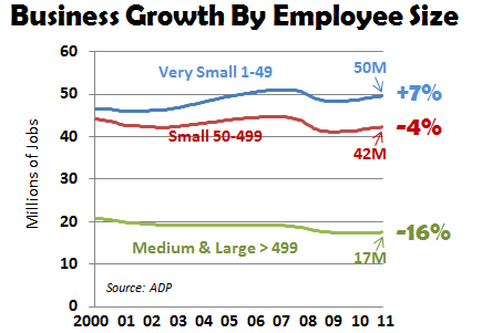 ADP National Employment Survey, shows that very small businesses with 1-49 employees grew +7% over the last dozen years, whereas small businesses with 50-499 employees and medium/large businesses with more than 499 employees lost -4% and -16% respectively over the same period of time.