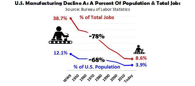 The U.S. Manufacturing supersector is vitally important to national sovereignty and an anchor tenant of the U.S. economy. Re-shoring and keeping American factories in America is a worthy goal. Even if America re-shores manufacturing jobs from foreign countries, manufacturing has limited upside employment potential due automation across the entire manufacturing value chain. From a wage perspective, manufacturing is no longer the high-paying industry sector that it used to be, nor will it be in the future. As opposed to looking to manufacturers as a principal supplier of “good” jobs, manufacturing focus should be on protecting the current set of U.S. manufacturers, focusing on next-generation manufacturing technology and processes, and recapitalization of the American industrial base and retooling its workforce.